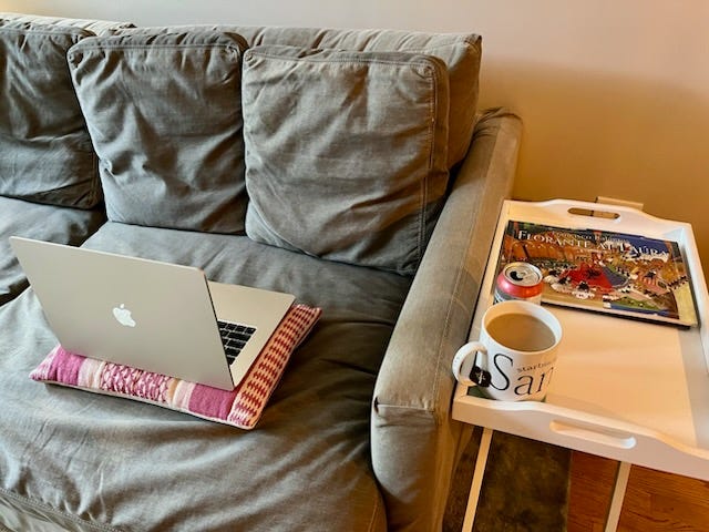 (LG’s typical writing spot, which is the left side of this old couch, with a big cup of tea, a can of sparkling water, and reading material — today it’s Francisco Balagtas’ Floránte at Laúra (translated by Randy M. Bustamante) — beside her.